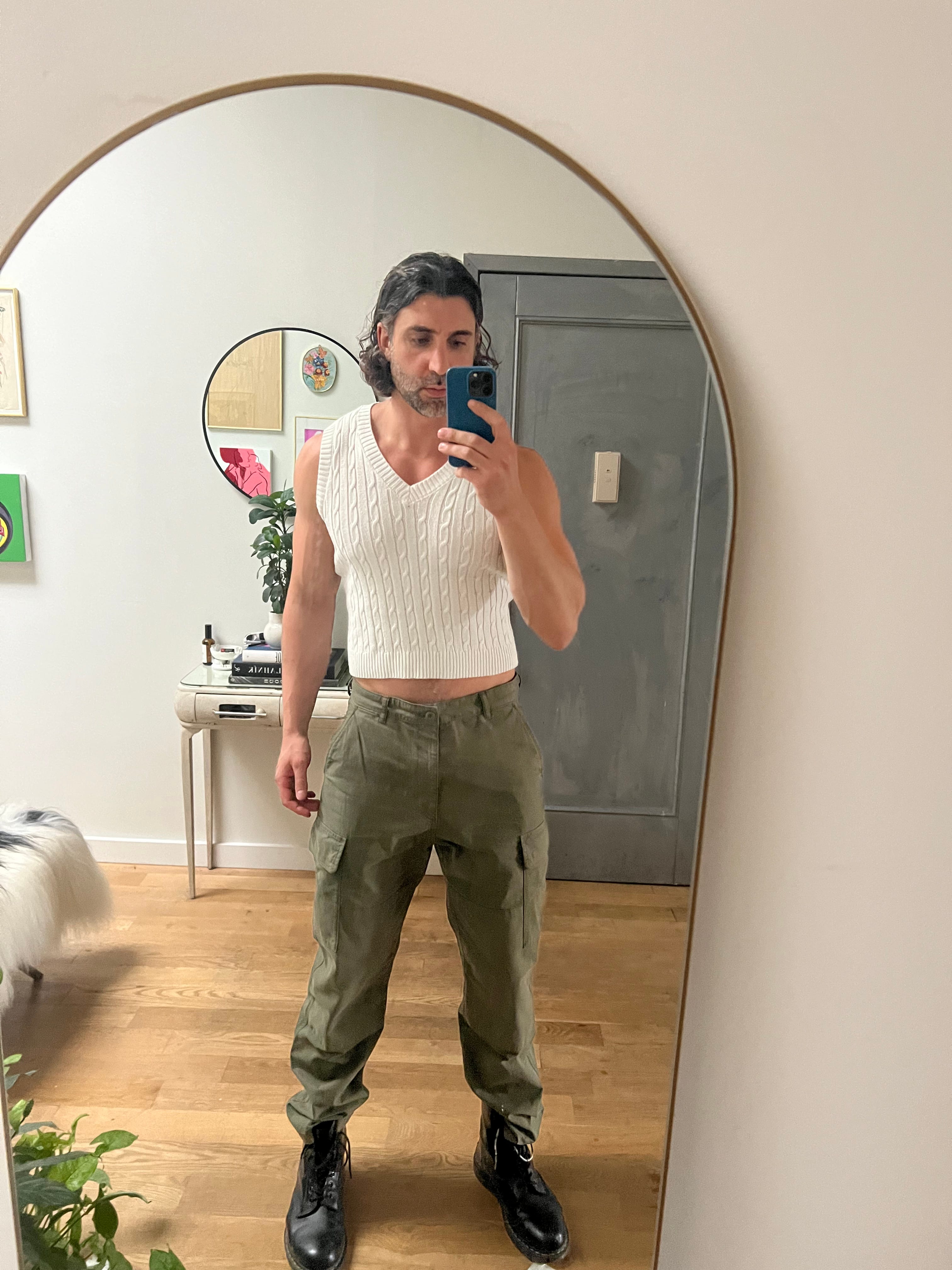 Also, in an attempt to look less sloppy on stage last week, I tried borrowing a shirt from my boyfriend. Here’s a picture I sent him to ask if it’s too small in the trendy way or just too small. He said the latter.